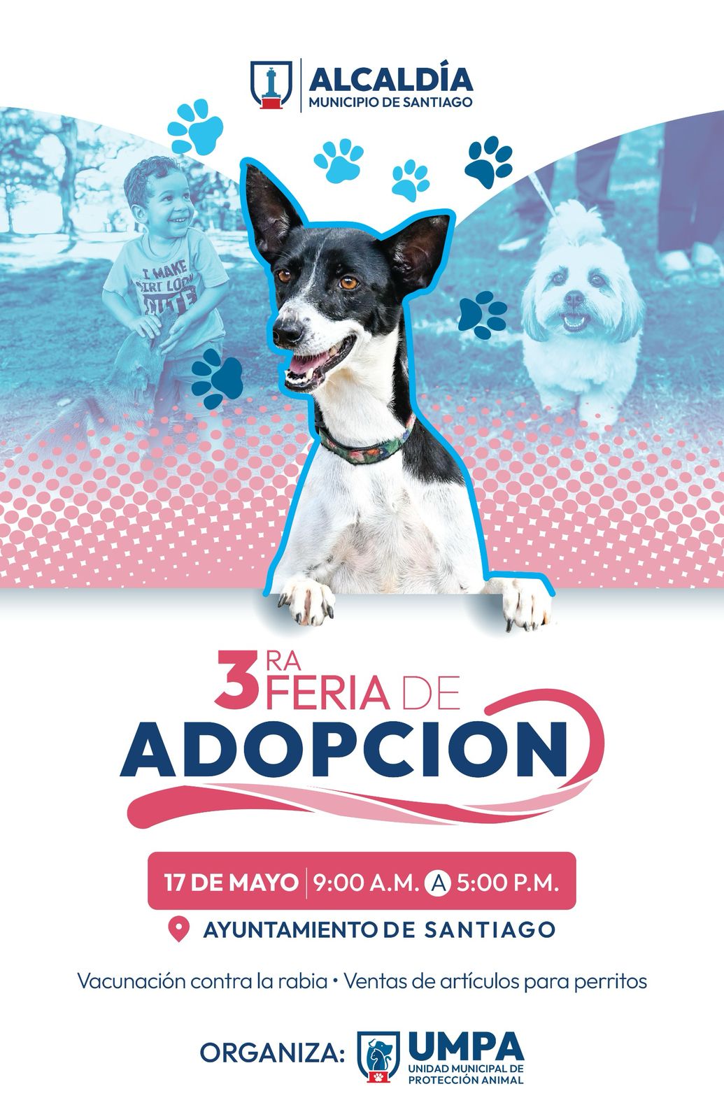Santiago de los Caballeros, RD. – La Alcaldía de Santiago anunció la realización de la Tercera Feria de Adopción de Perros, iniciativa que tendrá lugar este sábado 17 de mayo, de 9:00 de la mañana a 5:00 de la tarde, en las instalaciones del Palacio Municipal.