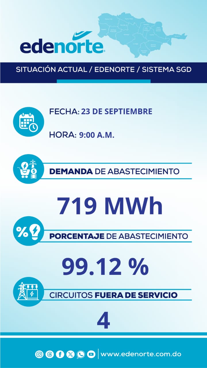 Santiago, República Dominicana.- El más reciente reporte de Edenorte Dominicana, correspondiente al 23 de septiembre a las 9:00 de la mañana, refleja una situación de estabilidad en el sistema eléctrico dentro de su zona de concesión.