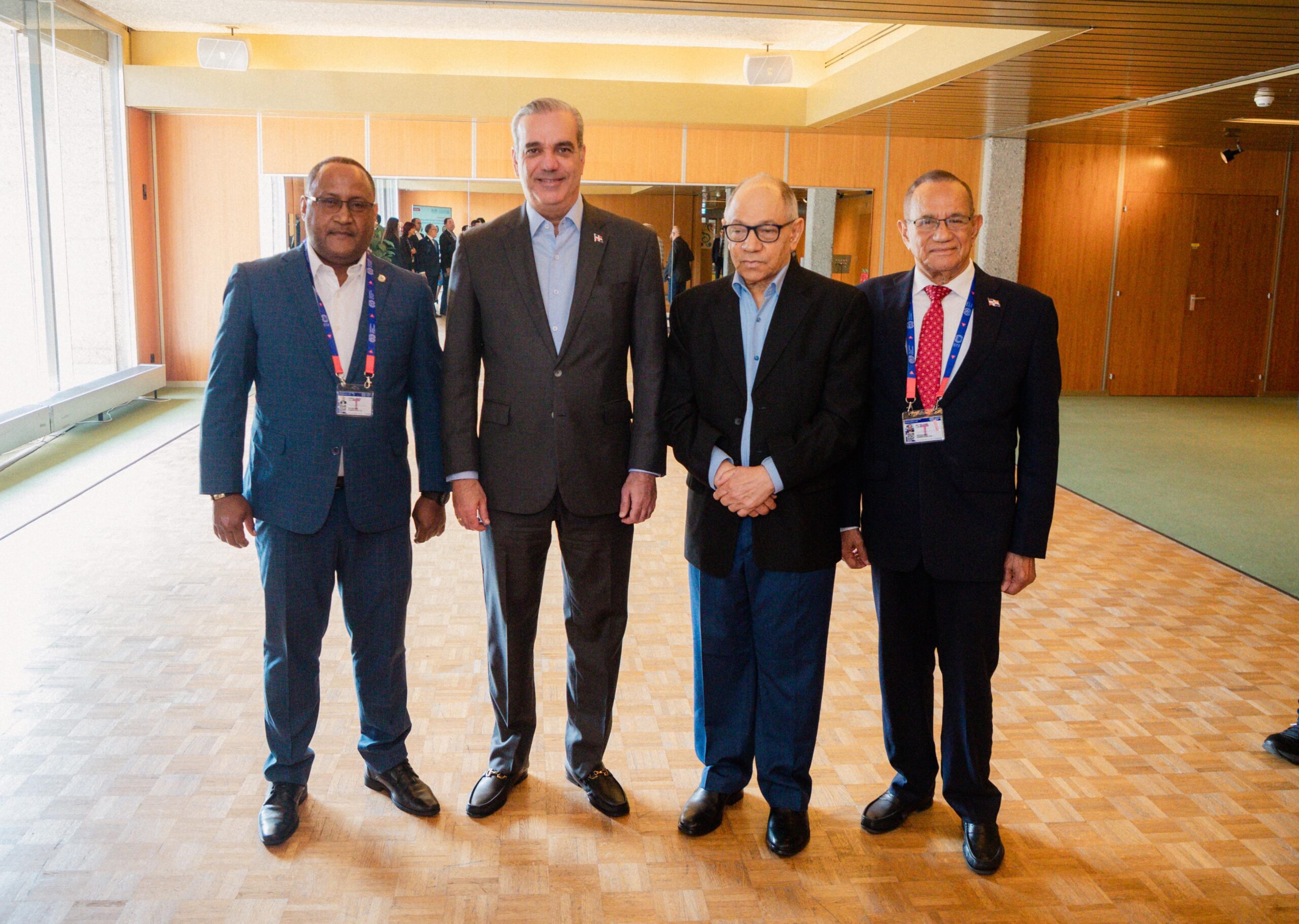 El jefe de Estado estuvo acompañado por la primera dama, Raquel Arbaje; el ministro de Trabajo, Eddy Olivares; los embajadores Pablo Valentín e Iván Ogando; sus asistentes Eilyn Beltrán y Noelia Shephard; el director del CUSEP, Jimmy Arias; y el director de Prensa, Daniel García Archibald.